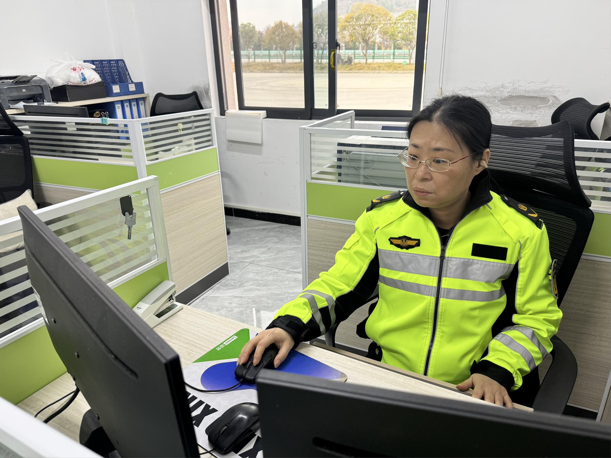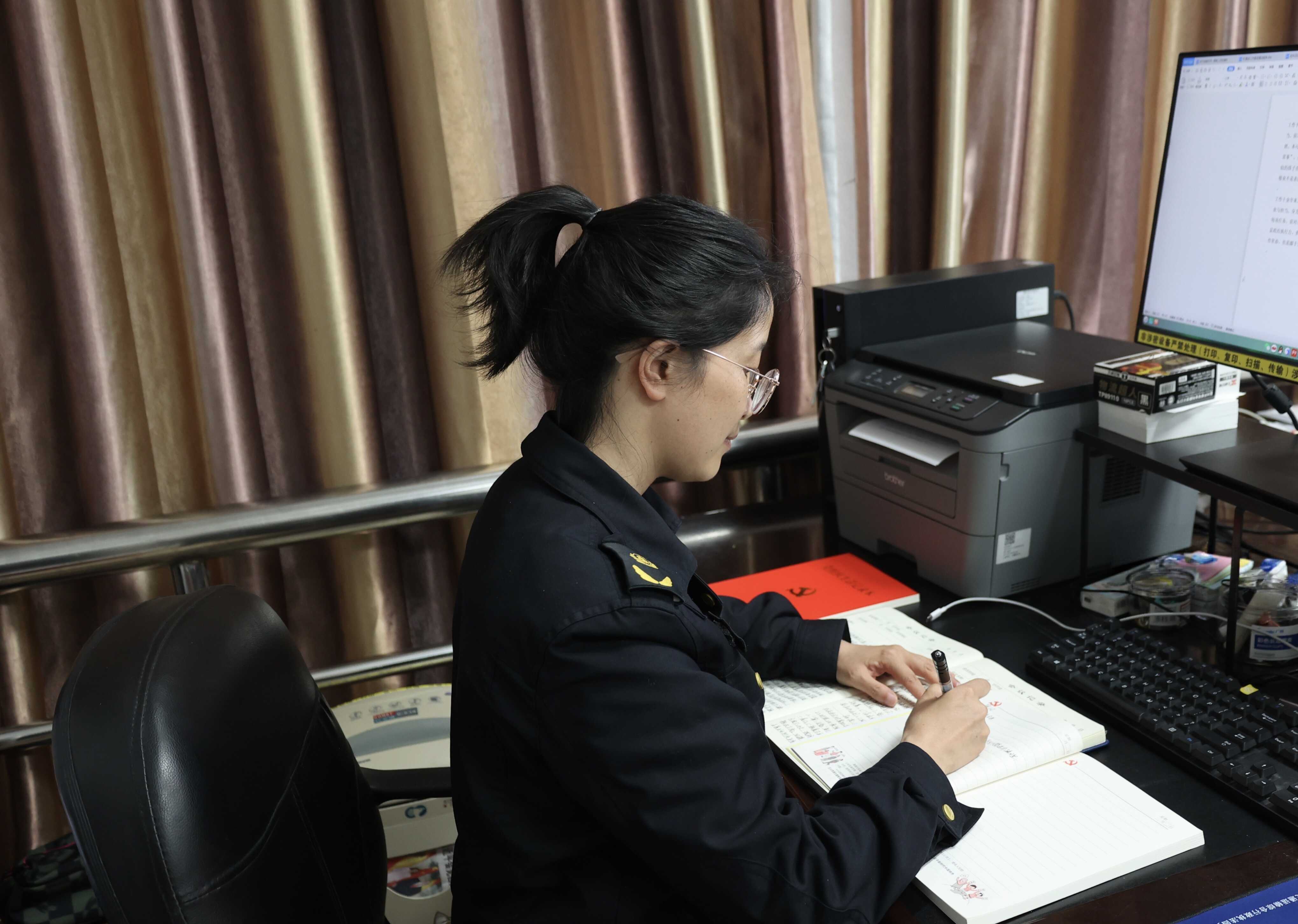 同一时间,四大队的林彬正一笔一划地在台账上登记上午最后一轮收文。临近退休的她对待每一份文件依然像第一天上班那样认真——核文号、登记、流转、归档,从容而笃定。她用三十年如一日的坚守,诠释着“在岗一分钟,尽责六十秒”的分量。