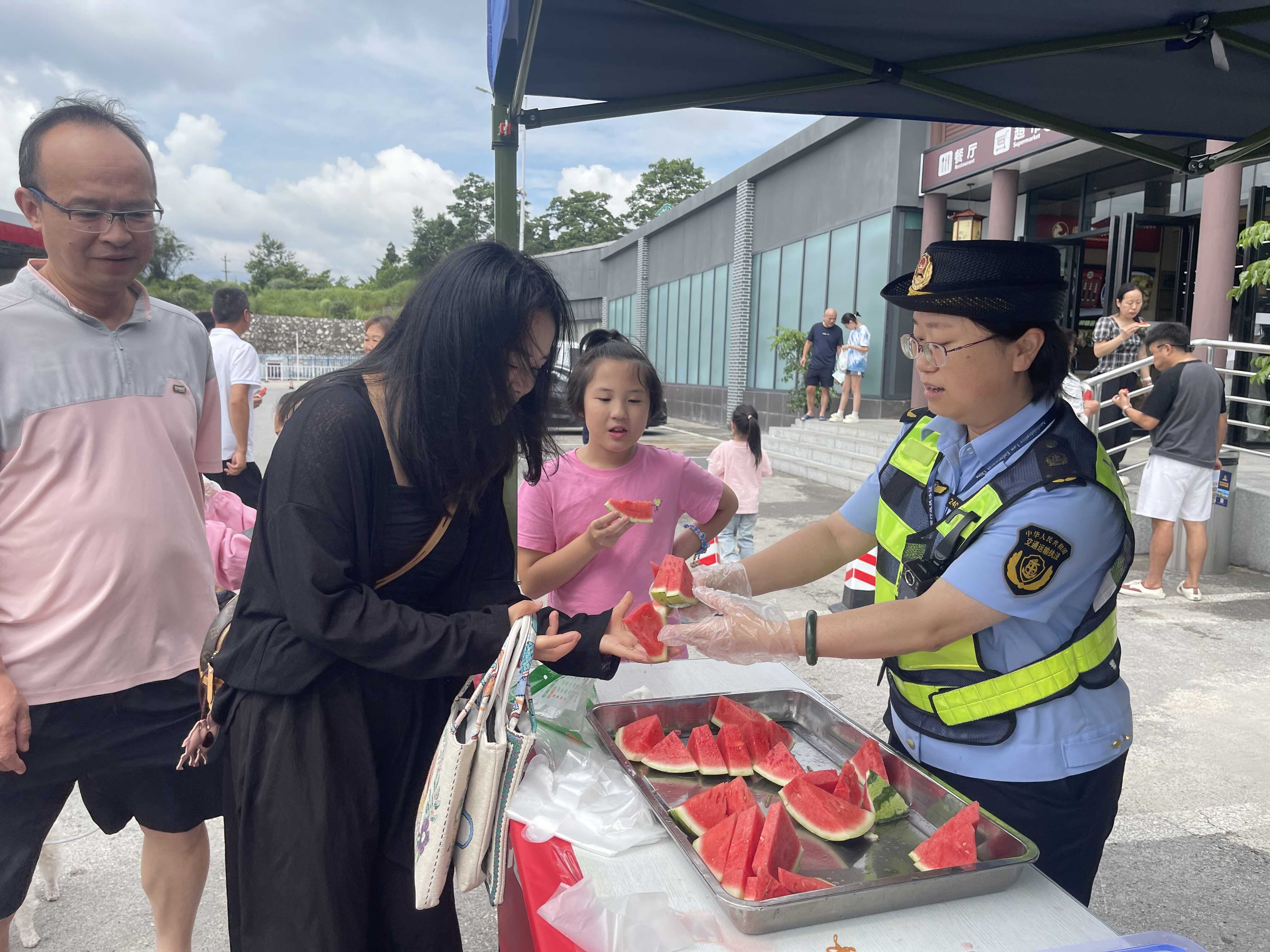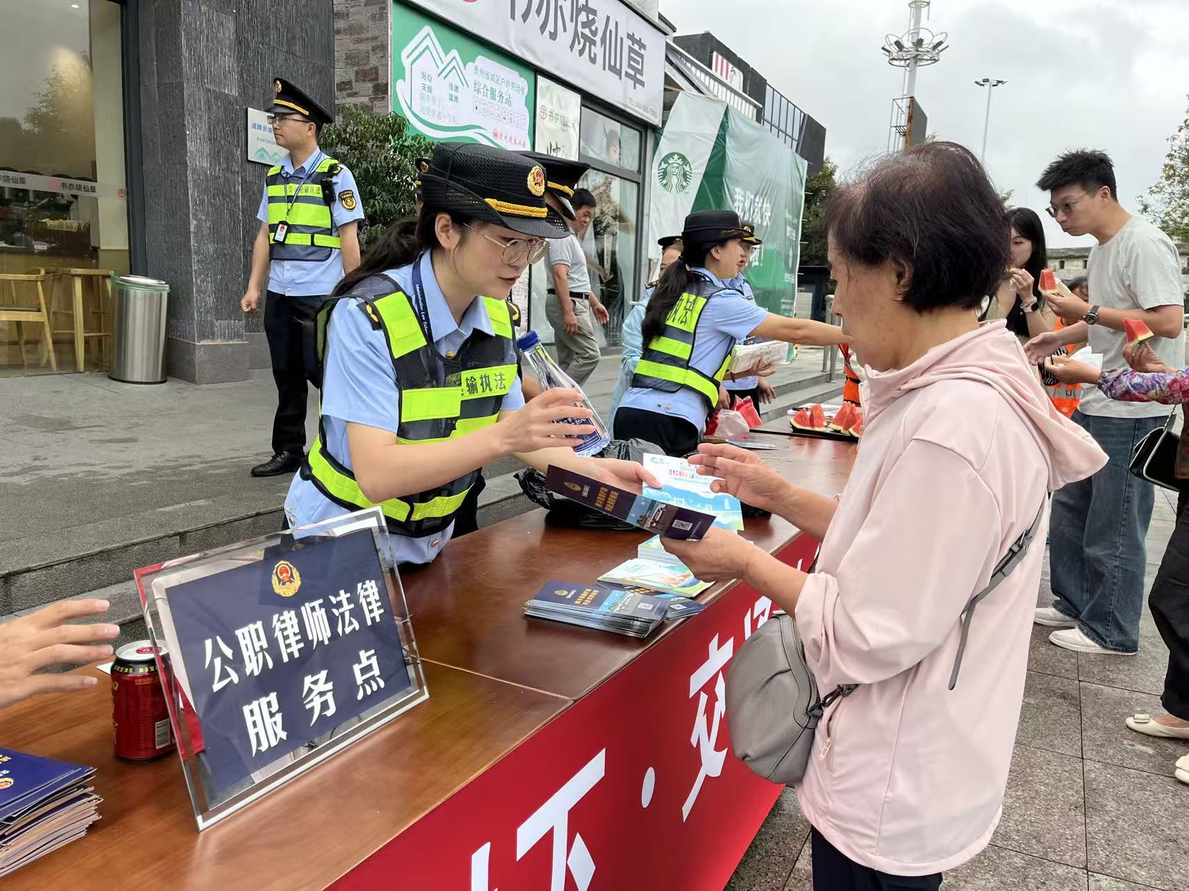 秦丹已在龙宫法治文化服务区“交通执法+公职律师”双服务点前摆好桌子迎接司乘咨询。