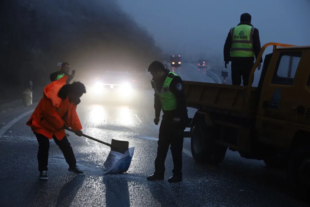铜仁营运中心为确保最快速度响应、最强力度处置,中心共预置应急人员134人,组建多支党员先锋队,分片包干、驻点值守。在最难啃的“硬骨头”路段,应急队员不畏严寒、连续作战,采取“人歇机不歇”的方式,对易凝冻桥梁、隧道口、长下坡等关键路段进行精准撒布作业,累计使用环保型融雪剂21.5吨。