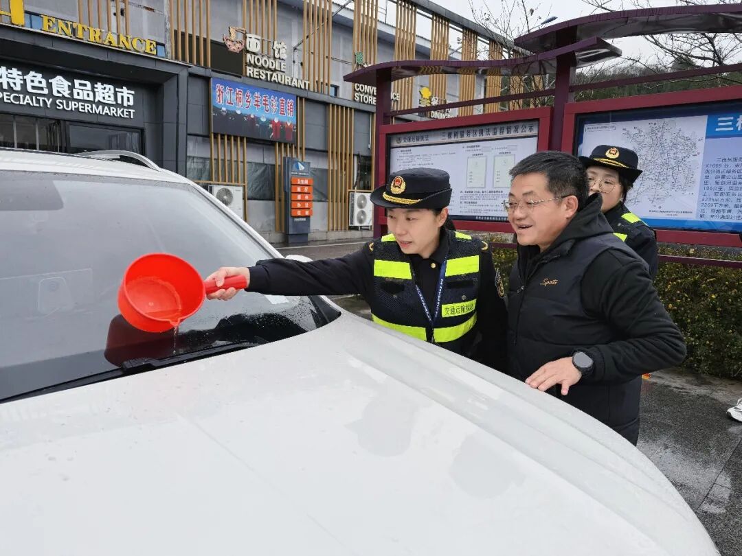 1月20日早上,受凝冻加冻雨天气影响,省交通运输综合行政执法七支队一大队在三棵树服务区巡查时发现,部分车辆挡风玻璃、雨刮器因低温结冰,无法正常使用,给司乘人员行车安全带来极大隐患。为及时消除安全风险,执法人员当即接取温水,逐一对受困车辆进行人工除冰,帮助车辆恢复正常通行条件。此次处置得到了外地司乘人员的高度认可,大家纷纷称赞贵州交通执法服务到位。