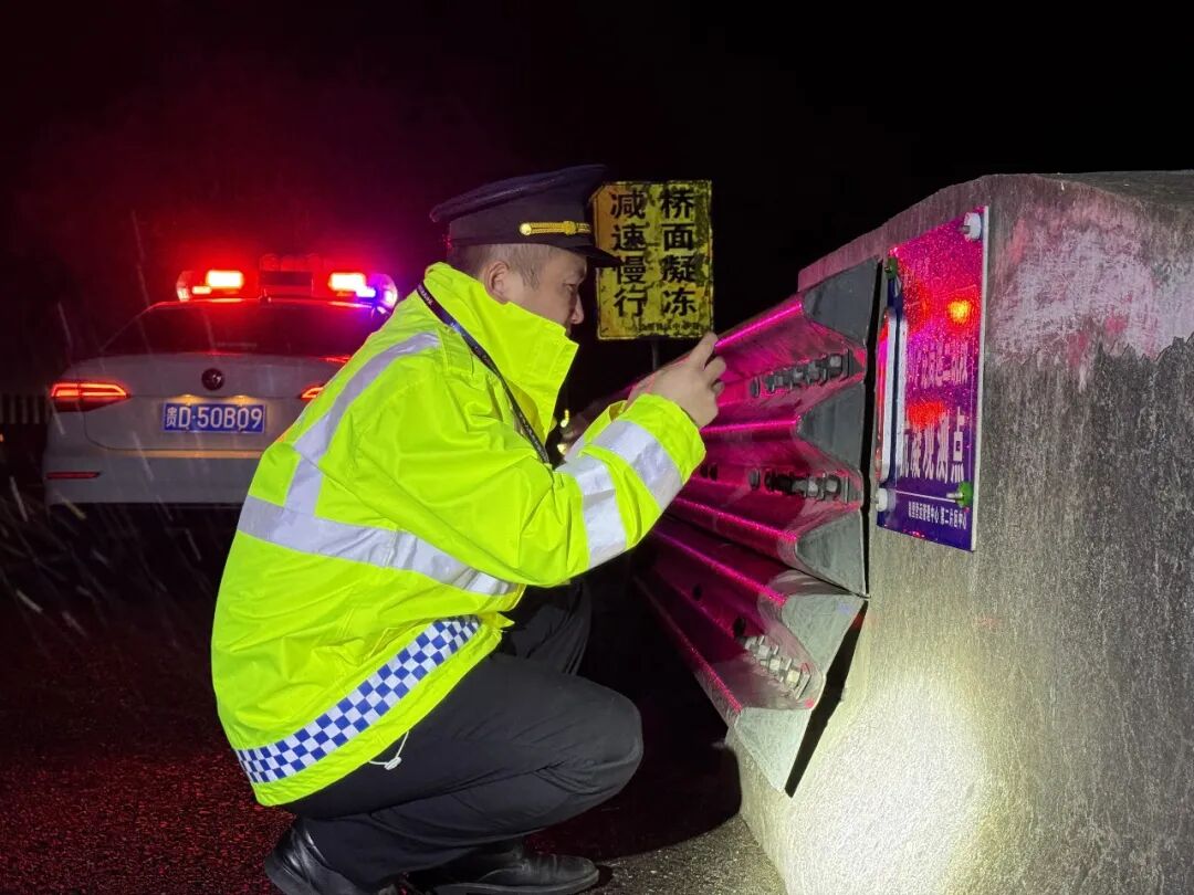 为了及时掌握凝冻情况和准确数据,1月20日凌晨4点,省交通执法七支队十六大队执法人员杨振还坚守在G60沪昆高速养寨Ⅱ中桥沿线,认真检查每一个抗凝观测点,核对桥面温度数据,细心地查看路面结冰情况,第一时间为路面结冰提供预警,默默守护着深夜里每一辆过往车辆的平安归途。